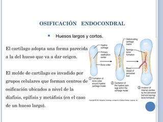 OSIFICACIÓN - IQB: MEDCICLOPEDIA Al mismo tiempo la división celular de los condrocitos seguida de la secreción de sustancias que forman la matriz resulta en un crecimiento intersticial. A partir de la 5 o 6 semanas de la destación el modelo cartilaginoso del hueso largo está completamente formado . El modelo cartilaginoso desarrolla un periostio y, en el centro se ...